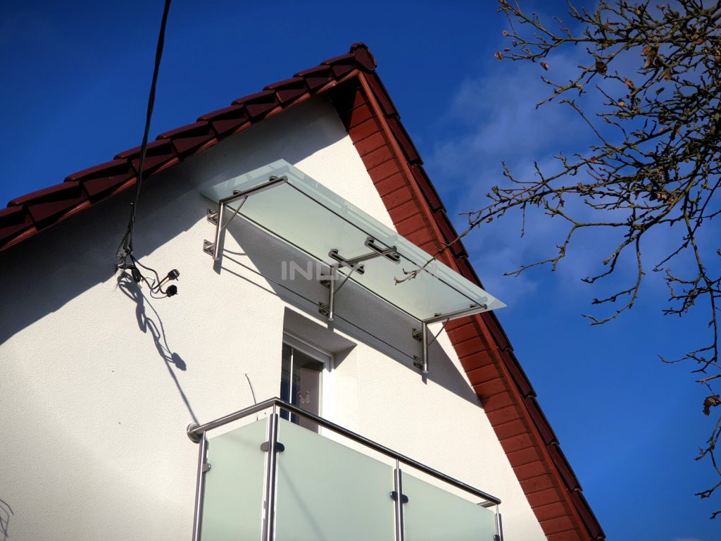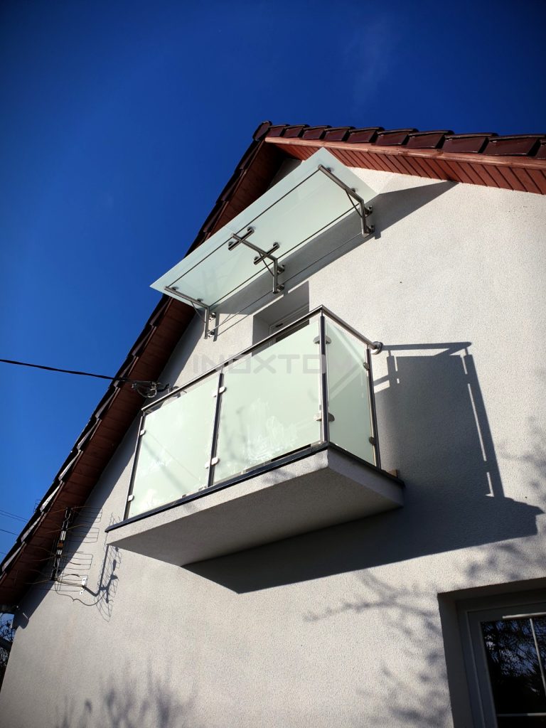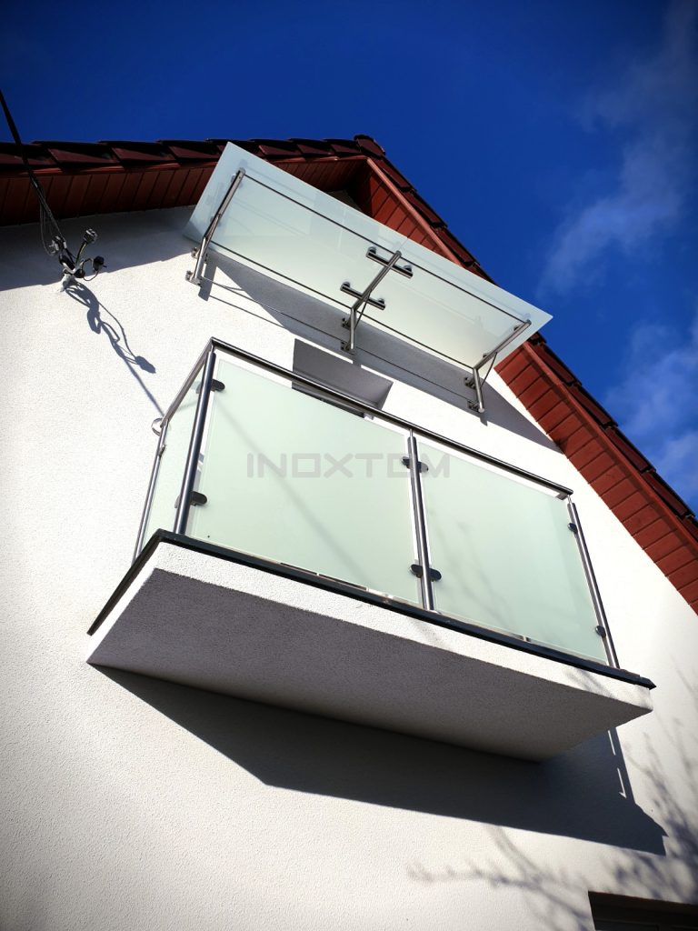 Balustrada była wykonana z rur ze stali nierdzewnej łączonych ze szkłem mlecznym, nieprzezroczystym. Daszek był zrobiony z takich samych materiałów oraz w podobnym stylu. Dzięki temu ładnie komponuje się z balustradą. Balustrada ze stali nierdzewnej ze szkłem mlecznym to nowoczesne i eleganckie rozwiązanie, które łączy trwałość metalu z estetyką szkła. Stal nierdzewna charakteryzuje się wysoką odpornością na korozję, co sprawia, że jest idealnym materiałem do zastosowań zarówno wewnętrznych, jak i zewnętrznych.